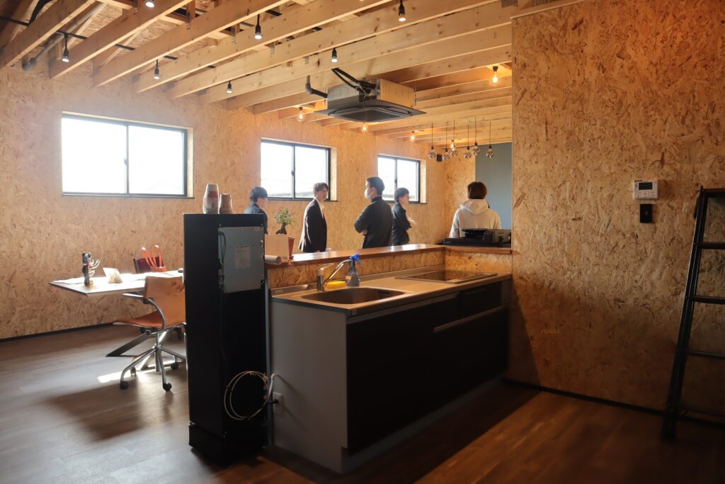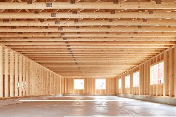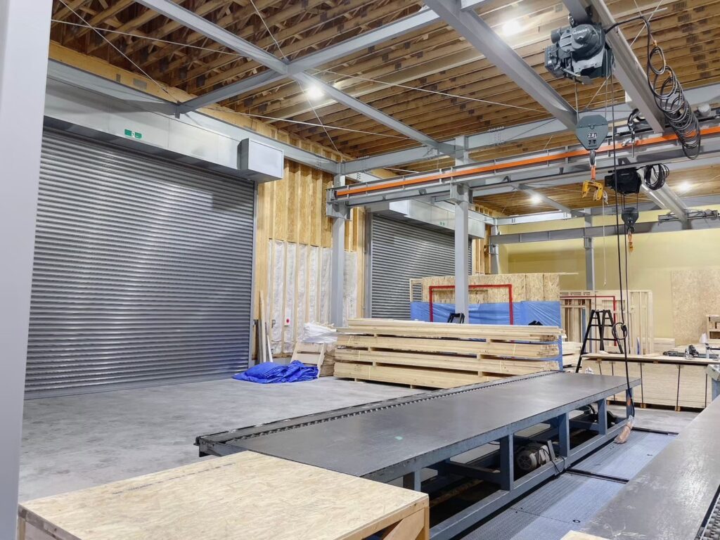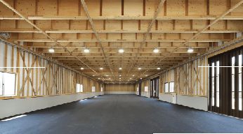 建物中間の柱を排除し、効率的な生産ラインを実現。一般流通材(SPF材)の組み合わせで、ここまでの大空間を可能にしました。