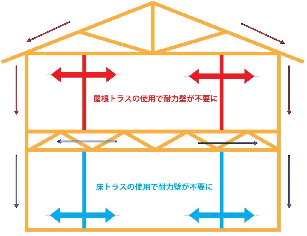 屋根だけでなく「床トラス」を組み合わせることで、木造建築の可能性はさらに広がります。